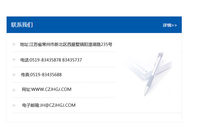 地址:常州市新北區友邦商務大廈1幢16、17層  電話:0519-85101652  傳真:0519-85112595  郵編:213022  網址:www.cz-jiayue_cn.sqteaw.com  郵箱:xiajifengaa@163.com
